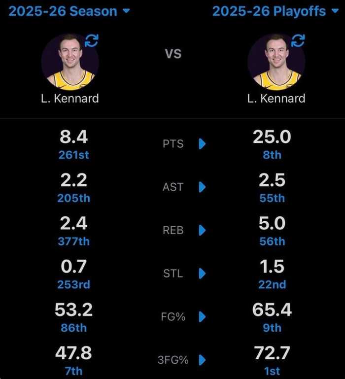 在过去两战,肯纳德场均出战40.1分钟,砍下25分5篮板2.5助攻1.5抢断,投篮命中率65.4%,三分72.7%,罚球80%。